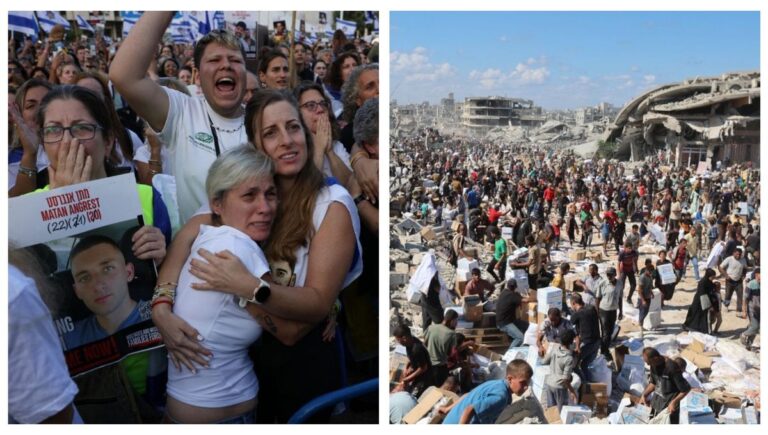 Place des Otages à Tel-Aviv, des milliers d'Israéliens ont applaudi en apprenant que le Hamas avait remis à la Croix-Rouge...